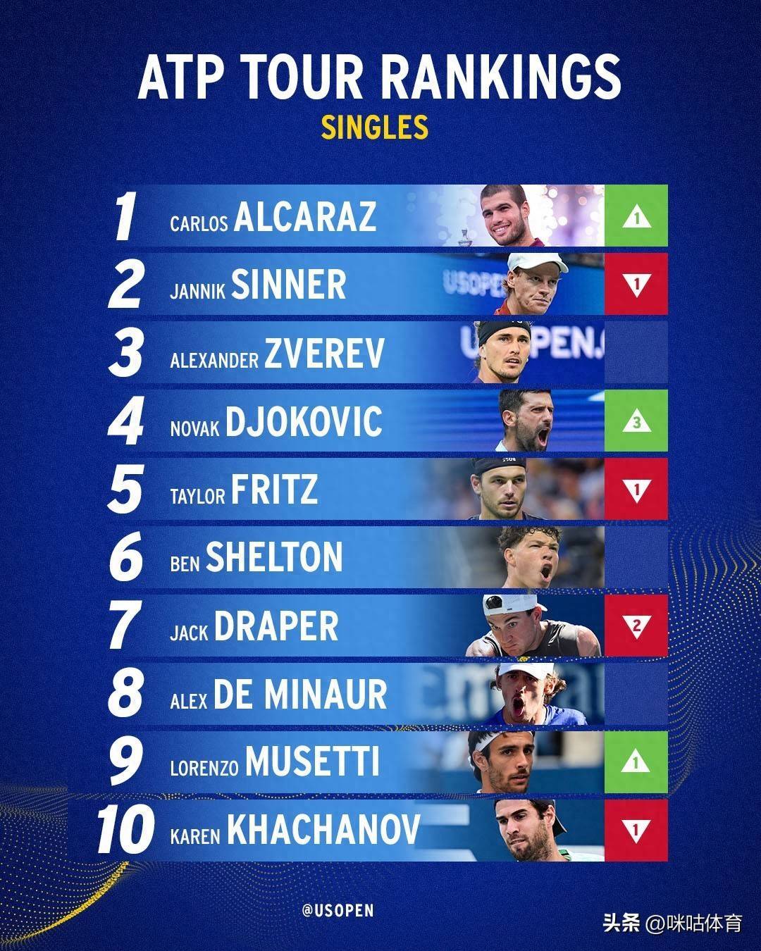 9月8日,ATP公布最新一期单打天下名次。西班牙选手阿尔卡拉斯凭借好意思网夺冠以11540分高出辛纳,时隔两年强势讲究天下第一宝座,这亦然他处事生存第5次登顶。辛纳以10780分位居第二,兹维列夫名依次三。德约科维奇凭借好意思网四强重返天下前四。