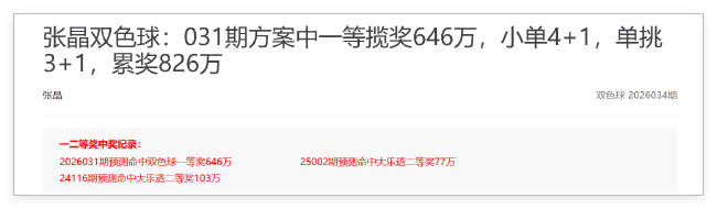 张晶:第26031期决议中一等揽奖646万,小单4+1,单挑3+1,近期统带826万[检察群众推选]
